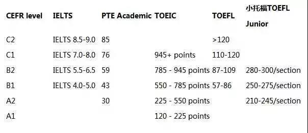 雅思、PTE、PTE、TOEIC、小托福TOEFL Junior相对应的级别: