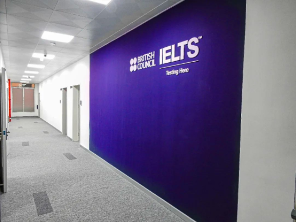 雅思标志性欢迎背景墙,地面防静电地毯,顶部格栅吊顶,为考生提供温馨的考场氛围。