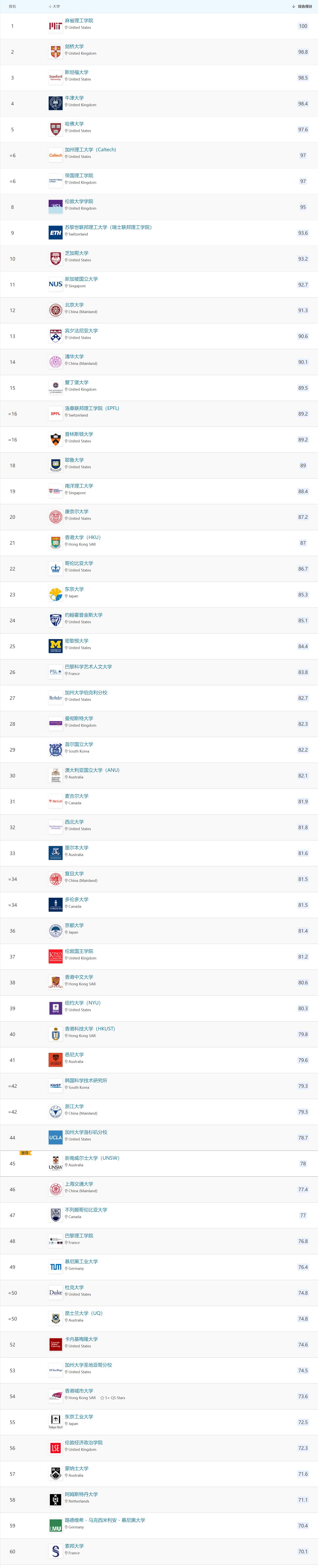 下图为QS排名前60学校