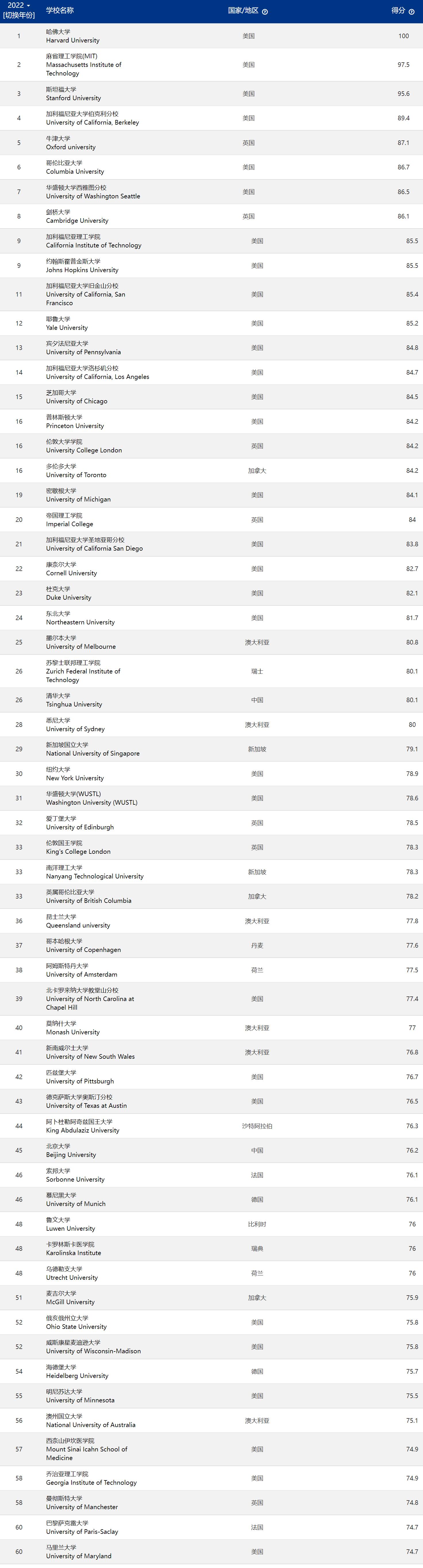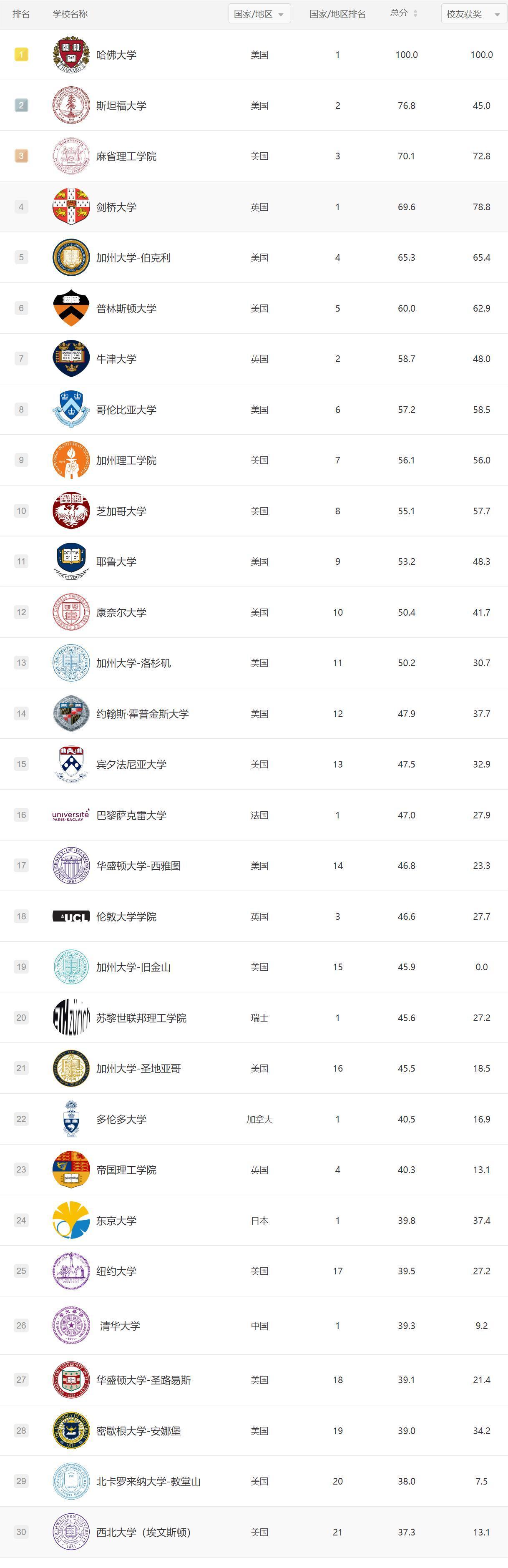 软科世界大学学术排名
