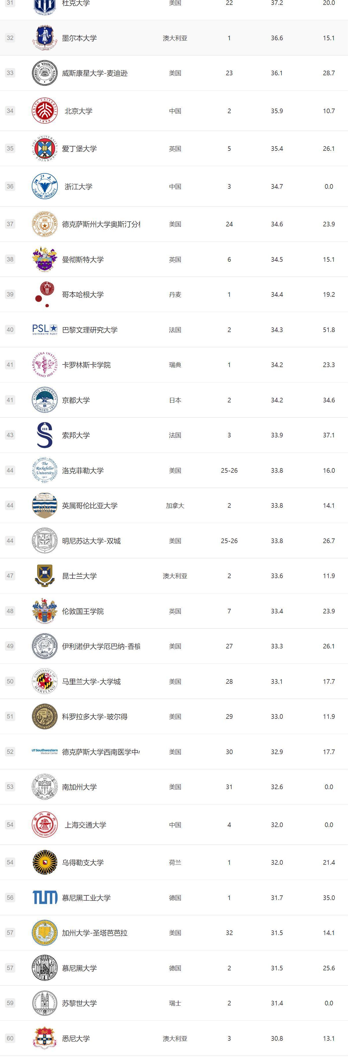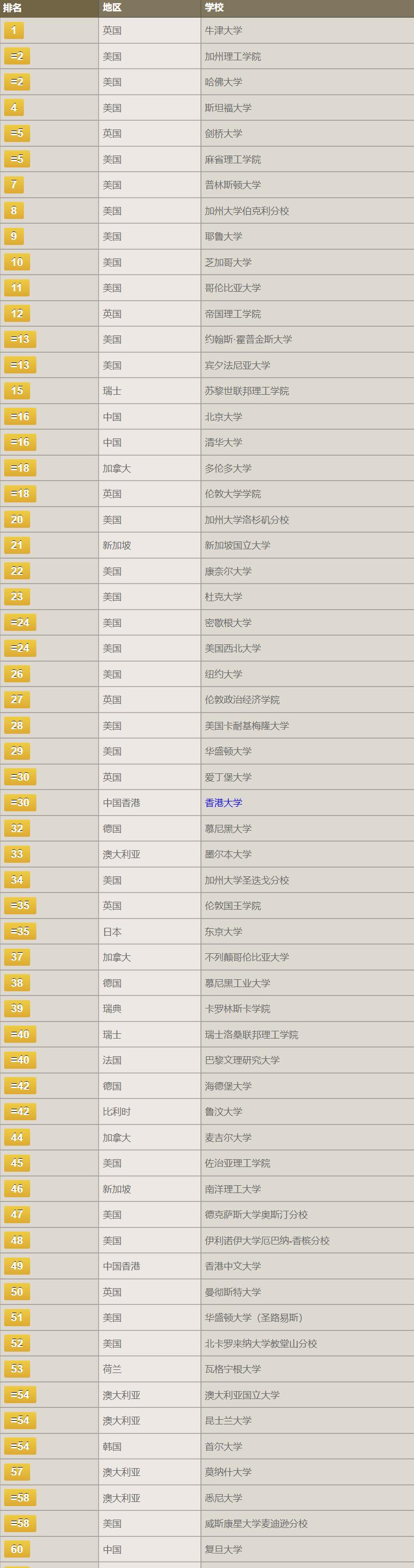 TIMES排名前60学校