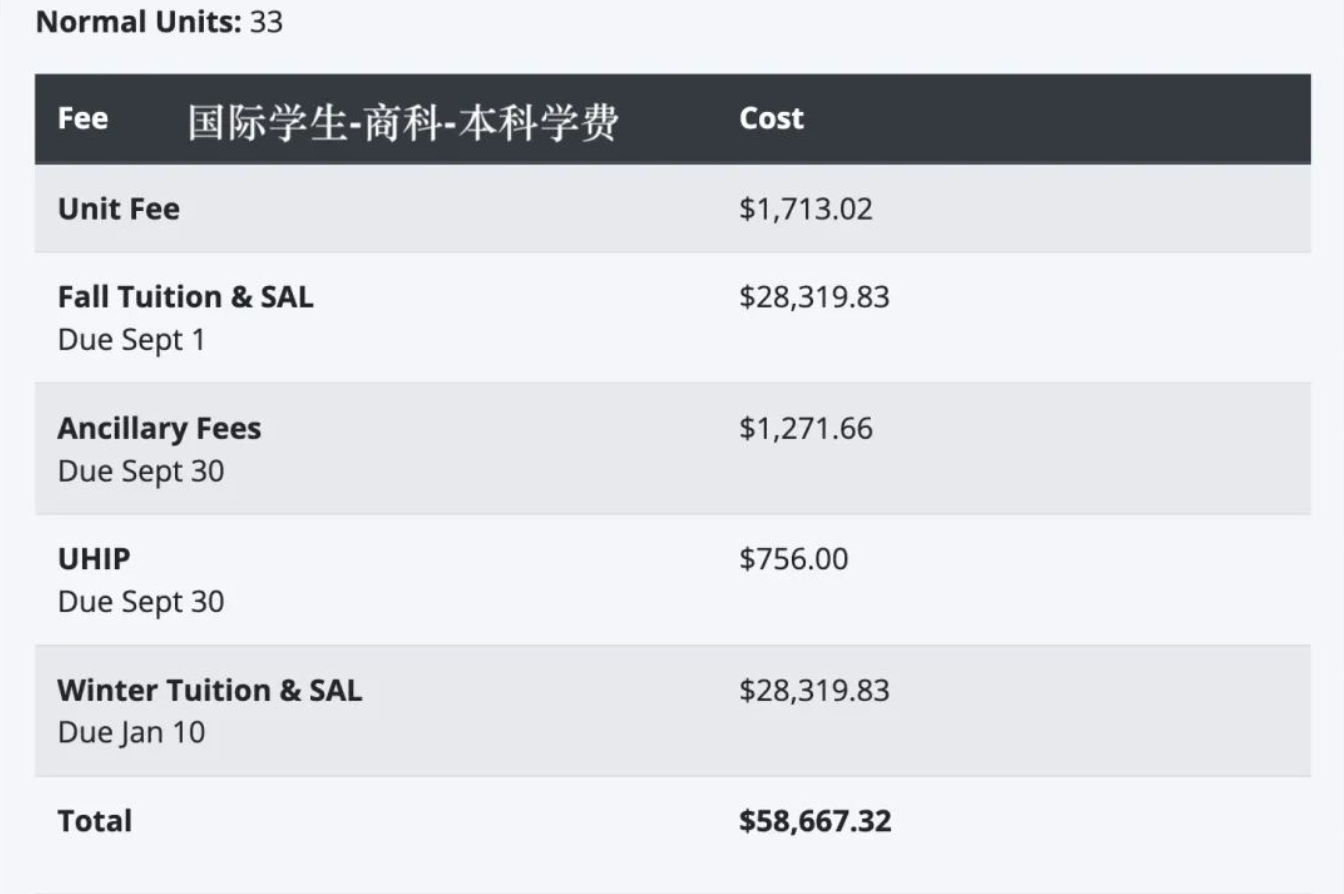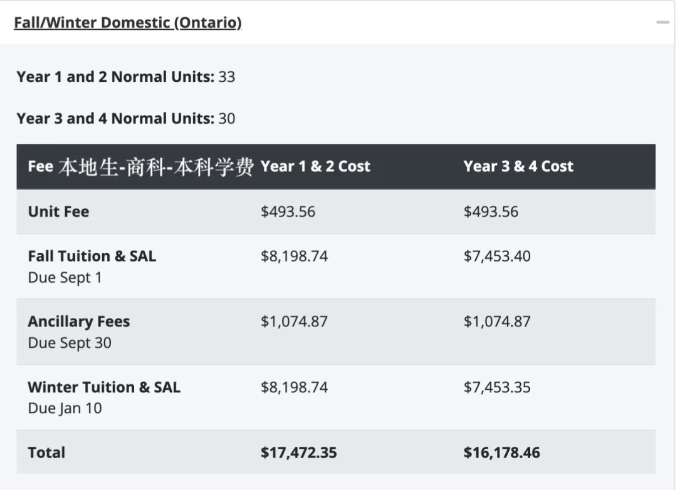 以商科Commerce为例,本科的前两年大约每年需要修33个学分,后两年大约需要30个学分。如果是秋季入学的本科生,有加拿大PR或加拿大公民身份,那么就读商科的大致学费是每年16178至17472加币(如下图1);如果是国际学生,学费大约为每年58,667加币(如下图2)。