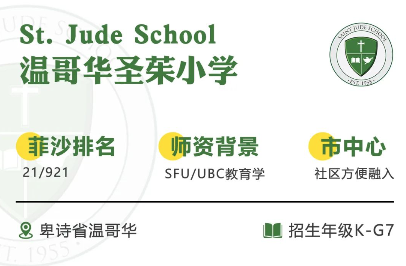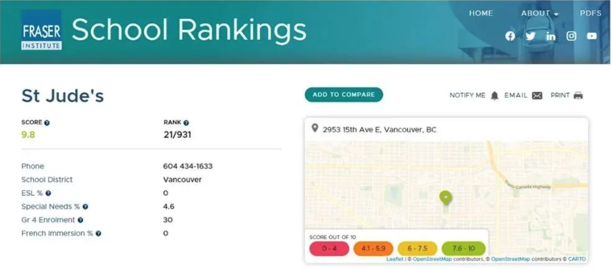 温哥华圣茱小学在BC省所有参与排名的小学中, 2020年最新排名21/931位 (前2%,Fraser Institute菲沙研究所官方数据),综合评分高达9.8分(满分10分),排名非常靠前。