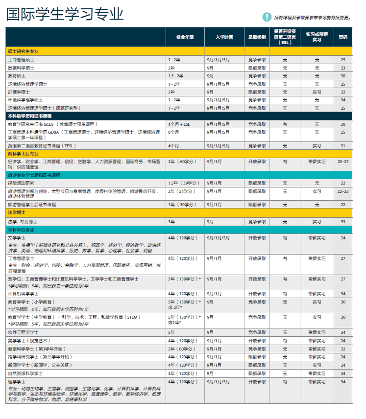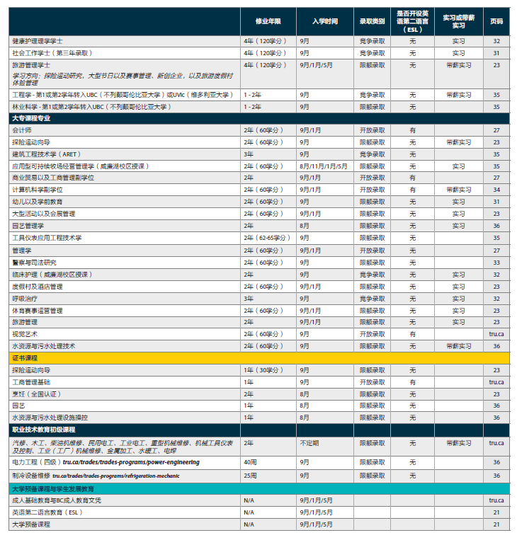 TRU 共开设超过140个不同专业,此外亦有55个网络远程课程专业,包括普通文科,商科,计算机科学,教育学,社会保障学,护理科学,普通理科,环境科学,法学,旅游管理,以及职业技术教育,平均班容量31人。