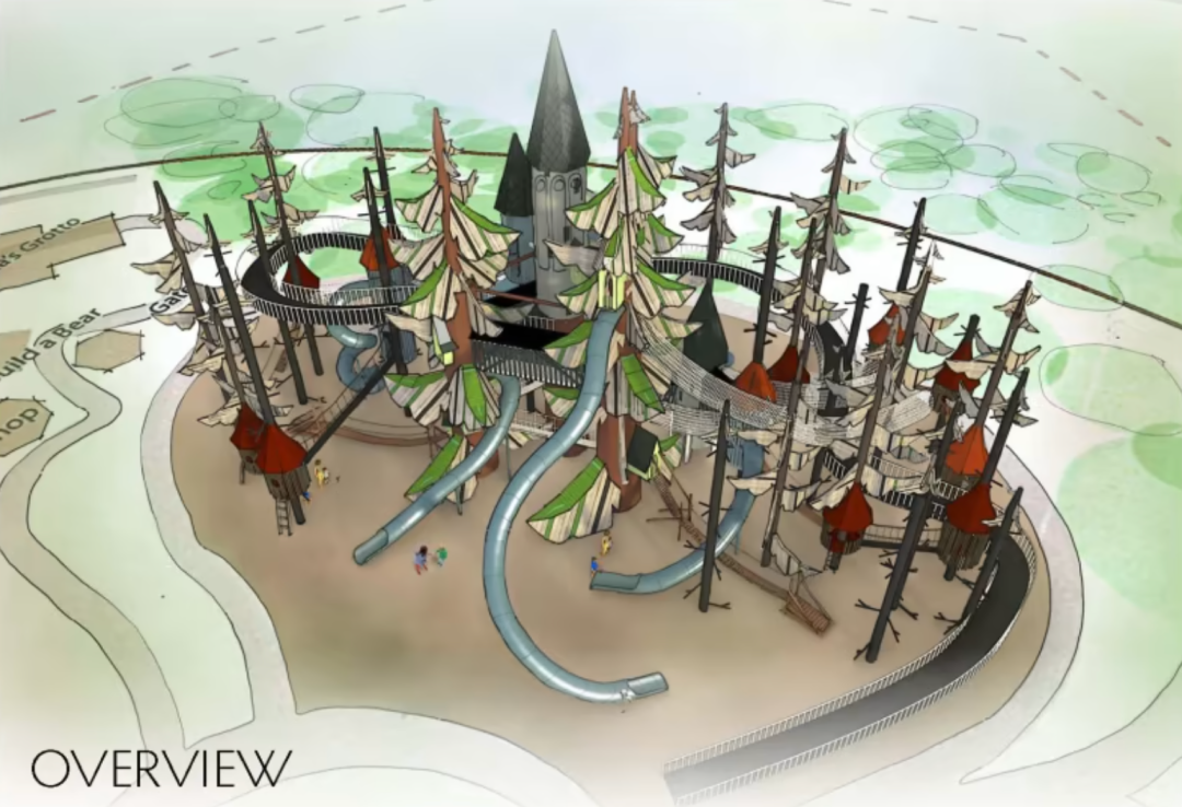 游乐园中的森林空地将散落着精灵、仙女、矮人等魔法生物的小木屋,每个区域都有高空滑索、滑梯和攀岩墙等设施。从图片来看,每个小木屋都具有不同的个性,可以说十分梦幻了!