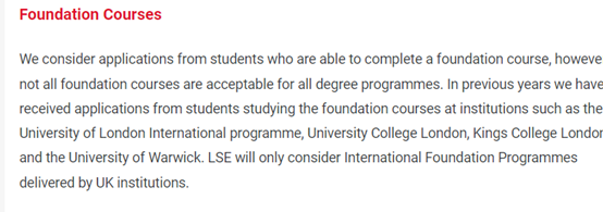 预科课程结束后,如果考试达到了所申请预科学校本科的要求,可以选择直接申请预科就读的大学,也可以申请更适合自己或者排名更高的英国大学本科。比如目前正在就读伦敦大学国王学院的预科,如果最终的成绩很优秀,可以申请直接入读伦敦大学国王学院的本科课程,也可以拿预科的成绩申请其他学校。但是请注意,有的学校对本科预科是有选择性认可的,比如LSE明确说明了不是所有的预科课程都认可的。