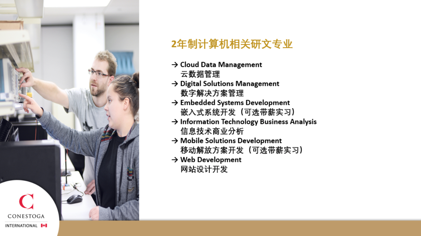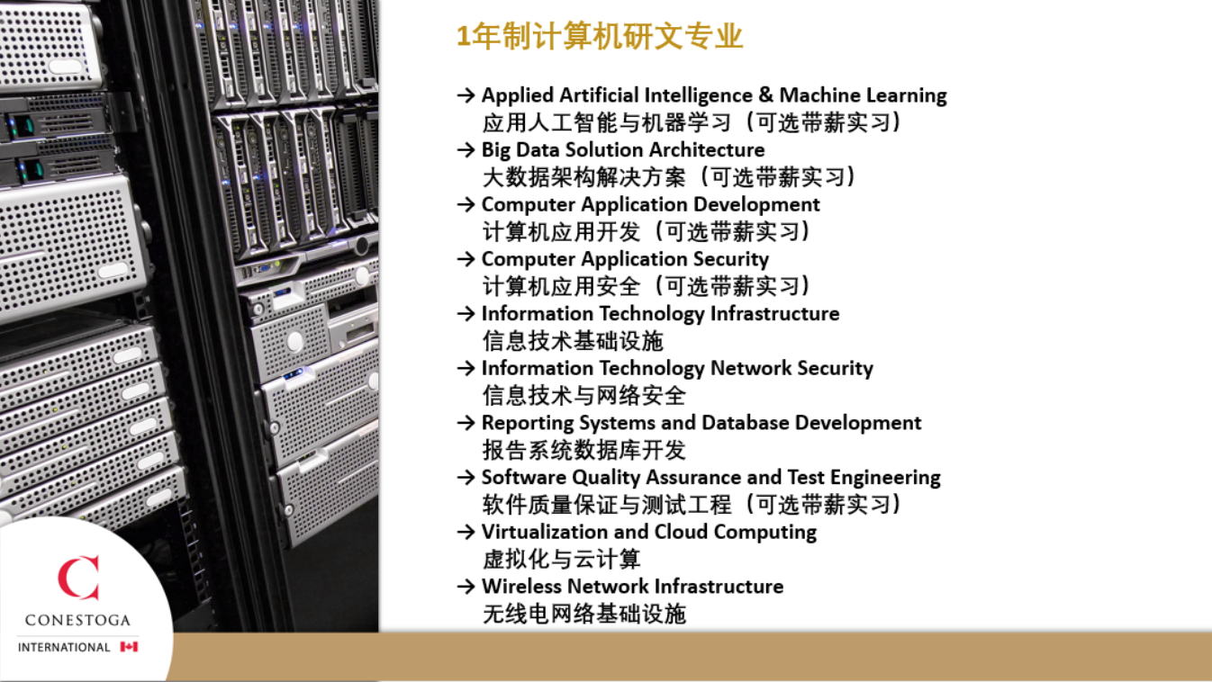 根据市场需求和行业特点,Conestoga除了开设热门的计算机科学4年制本科荣誉学士学位以及2-3年制计算机大专文凭专业外,还专门针对成人国际学生,特别已经在本国或地区完成大专以上学历教育背景,希望到安省学校深造过渡,毕业后顺利进入加拿大职场的人士,提供了非常详尽的计算机研文相关专业方向选择,例如: