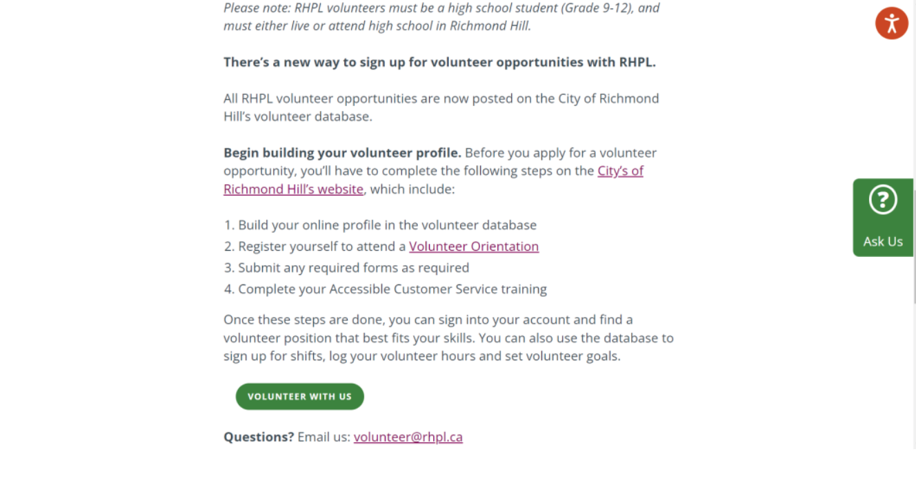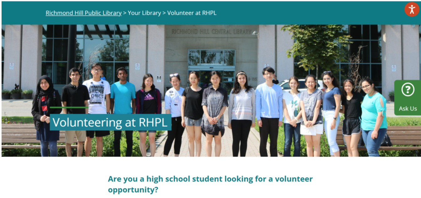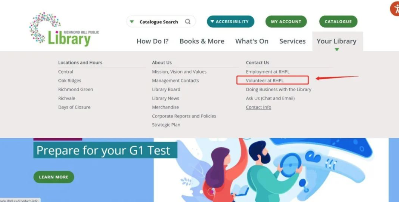 我们用Richmond Hill 的社区图书馆官网作为例子。首先,你需要登陆图书馆的网站,找到Your Library,然后点击Volunteering at RHPL。