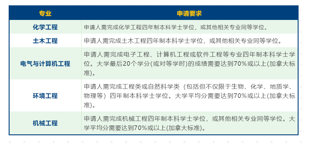 若学生的本科学习背景不能满足申请要求,则需要先修读工程研究生委员会(Engineering Graduate Studies Committee)推荐的工程类过渡课程,并满足英语语言要求。