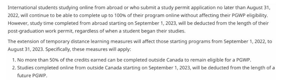 对于从2022年9月1日至2023年8月31日开始课程学习的同学,只要在加拿大境外进行线上学习的比例不可超过总课程的50%,就可以保证PGWP的申请资格。