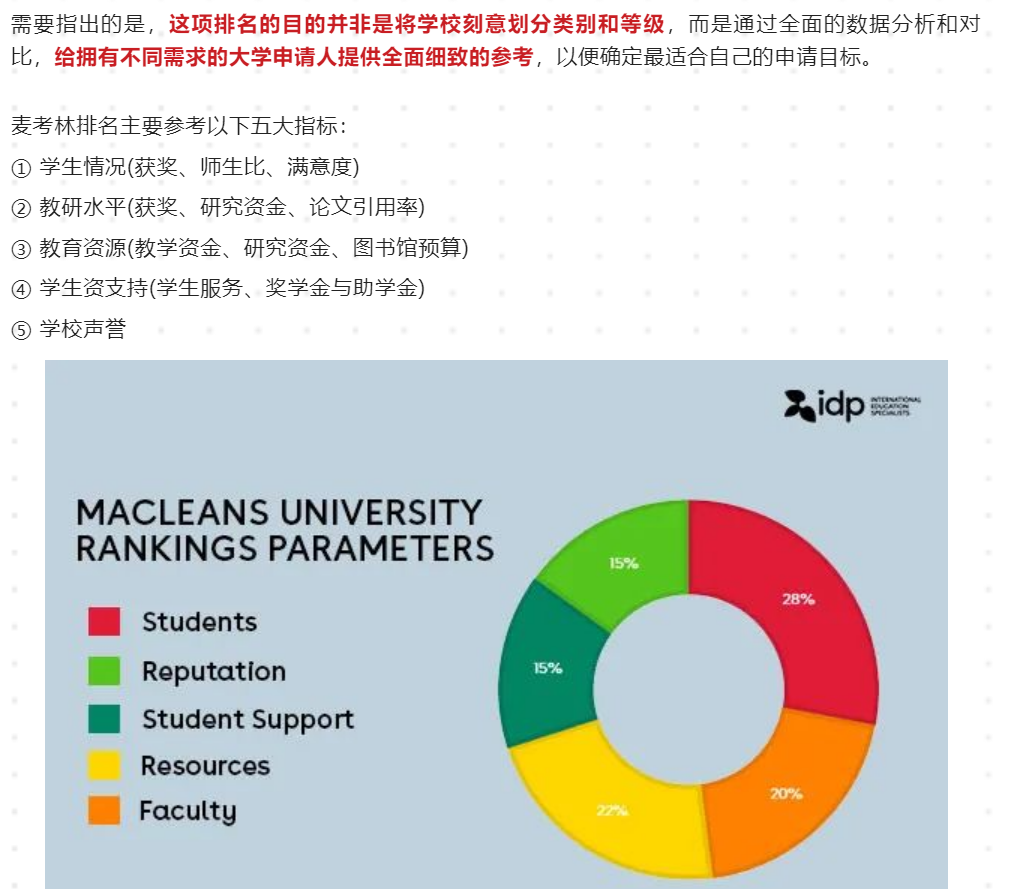 在选择学校之前,我们可以先了解一下大学排名的结构组成,以大家选择加拿大大学时参考较多的麦考林排名来说,以下因素是排名中不同的参考依据。