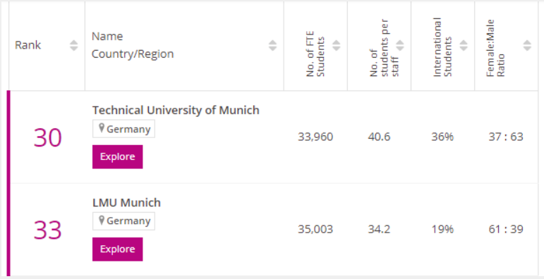 慕尼黑工业大学(TUM)排名今年再创新高!从去年的38名一跃超过曾经稳坐头把交椅的慕尼黑大学(LMU),今年获得了30名的好位次。