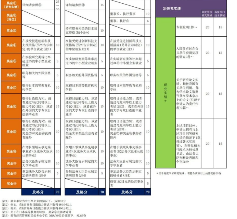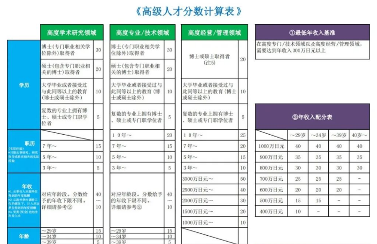 高度人才签证实质上就是对于符合条件的外国人给与申请签证的优待政策,通过高度人才政策实现吸引海外优秀人才,达到推动日本经济发展的效果。它会从五个维度进行打分,分数达到70分以上就可以申请了。达到80分甚至在1年后就可以申请永住。这五个维度分别是:学历、收入、日语水平、在日本投资的规模、在日本国内或海外的学术研究实绩等。
