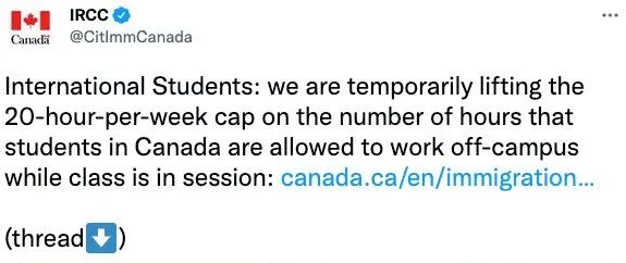 加拿大政府宣布,从2022年11月15日至2023年12月31日,加拿大将调整国际留学生上课期间在校外工作每周20小时的上限。据统计,目前在加拿大的超50万留学生将有资格享受这一政策。