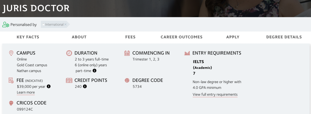 对于本科阶段学习了法学以外的其他专业的学生来说,格里菲斯大学的法学硕士(Juris Doctor)课程将是一个法学学士学位的很好的替代选择,能帮助大家投身法学行业。