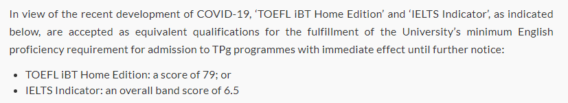 今年城大在10月份的一次更新官网中,确实 能看到一些专业显示了接受相关的线上语言成绩 ,但是 并不是所有专业都接受 ,Mastermate总结了一下学校 不接受 TOEFL iBT Home Edition和IELTS Indicator的专业: