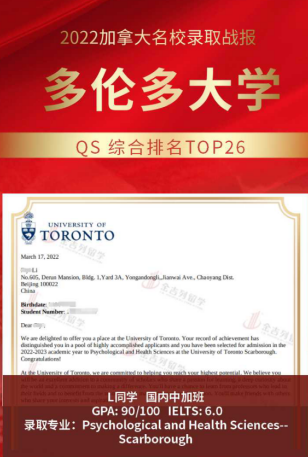 学生就读的是安省高中文凭课程,成绩非常不错,但是英语基础不是特别好,前后考了三次,用了一年的时间,最终考出雅思6分。学生所有课程里,生物、化学、数学是强项,每次都能在95分上下,且在高二时参加了一项国际脑科学竞赛,虽然没有获奖,但是这个比赛的准备过程让学生收获很多,也更加坚定了学生想学心理学的决心,所以我们的文书团队在确定文书写作思路时,结合学生的兴趣、课程重点突出了竞赛准备经历和收获。直到最后一刻学生都还在坚持雅思学习,希望刷高到6.5,但是由于疫情,没能参加递交申请前的最后一场考试。但结果很让人满意,我们收获了多大的录取。