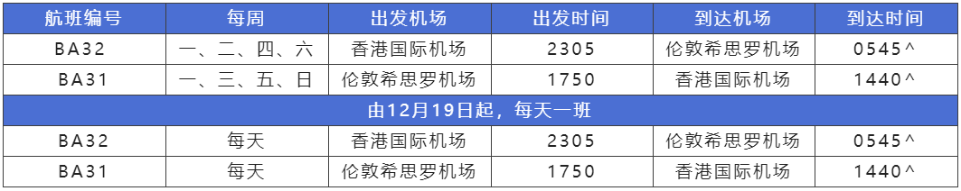 自2022年12月5日起,英航将恢复往返伦敦希思罗机场至香港的客运服务。航班将每周营运四次直至12月18日,之后每天一班。
