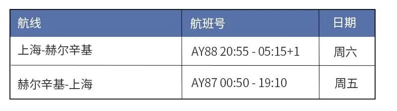 自2022年11月4日起,芬兰航空将调整上海至赫尔辛基往返航班时刻,新的航班时刻请参考下表: