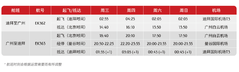 自10月2日起,阿联酋航空迪拜往返广州的客运服务将由目前的每周两班增加至每周四班,即在每周三、四、六、日各运营一班。