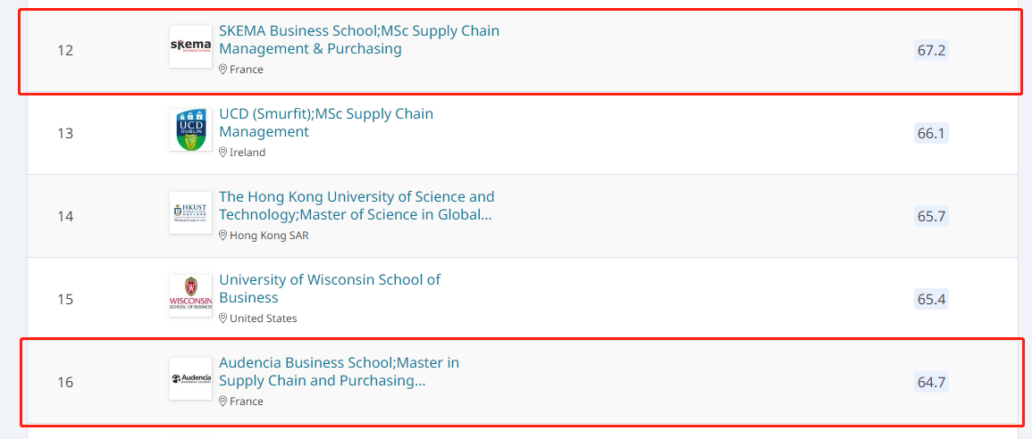 在供应链管理领域法国也有四所排名比较靠前哦,小编觉得,法国在之后极有可能后来者居上,成功冲进前十的!