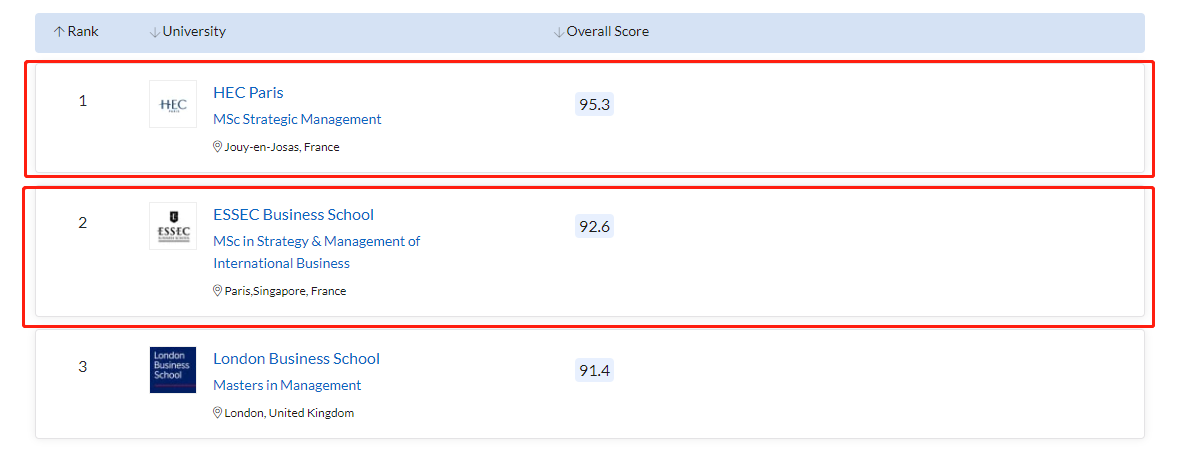 让我们来分别看一下法国商学院在世界前十商学院中的占位情况吧~