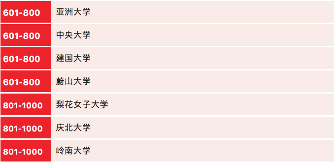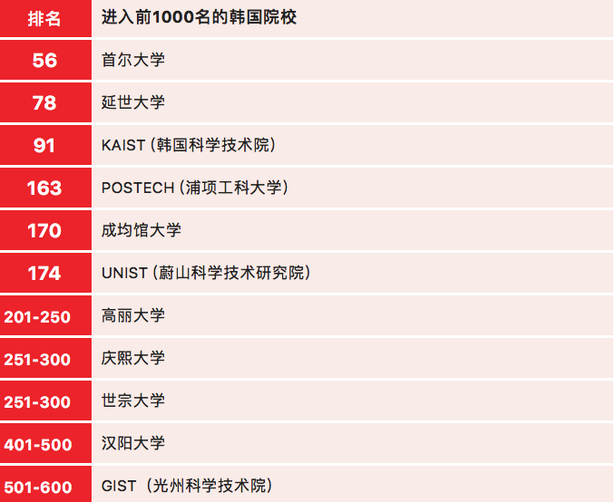 韩国共有37所大学上榜,排名前200的韩国大学有首尔大学(56位),延世大学(78位),KAIST(91位),POSTECH(163位),成均馆大学(170位),UNIST(174位)。