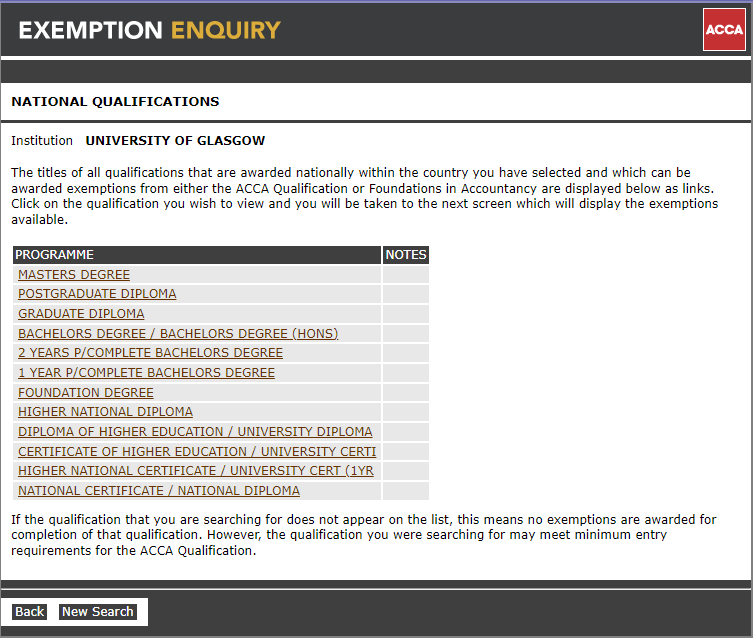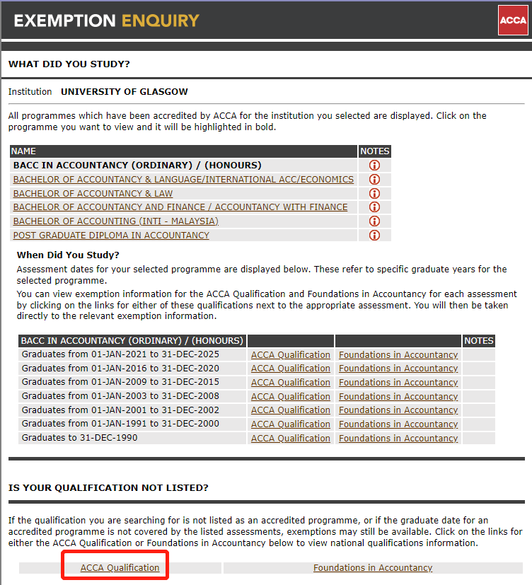 然后:点击【大学名称】,可看到大学开设的相关商科课程,选择【ACCA Qualification】,查阅具体攻读学位课程的ACCA考试科目豁免情况: