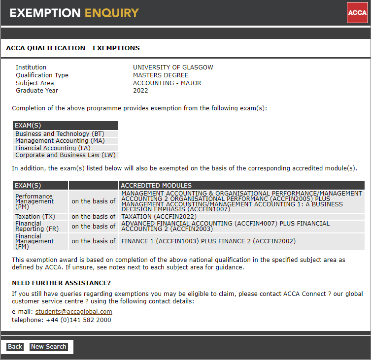 这样一举两得的方式,自然大受欢迎,但是如何确认申请的专业是否有免考,很多学生并不清楚。在这里附上如何查询毕业院校、专业课程可获ACCA免考科目的方法,供大家参考。