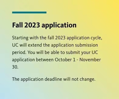 需要提醒大家注意,从2022-2023申请季开始,UC九校的申请提交日期变更为 10月1日至11月30日 ,比往年延长了1个月的时间。