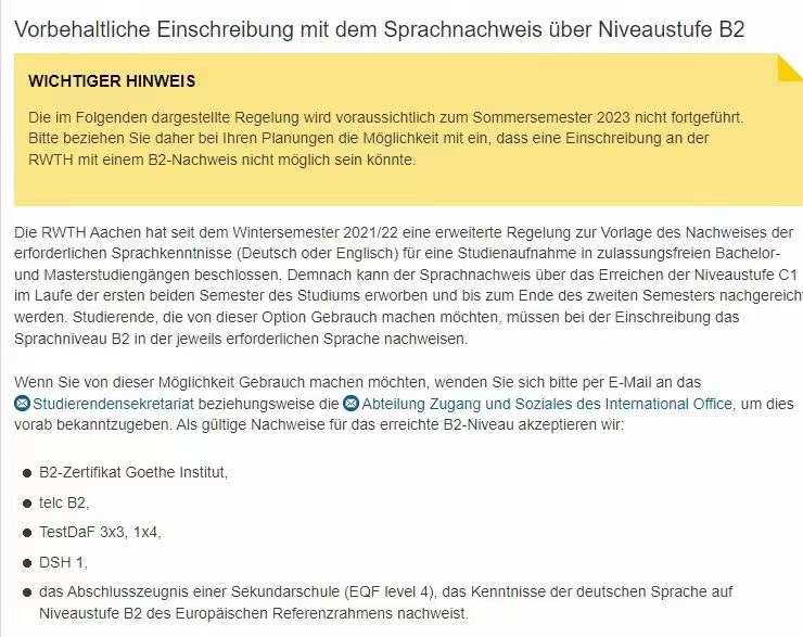 这一政策生效日期为2023年夏季学期(SS2023)。在此之前,亚琛工业大学允许学生用B2等级证书(德福33+4或歌德学院B2证书或DSH1级等)注册入学,并在前两个学期内补交C1等级证书(德福44或歌德学院C1证书或DSH2级等)。此政策一出,意味着学生必须在申请时具备满足条件的语言证明,不接受后补语言成绩。