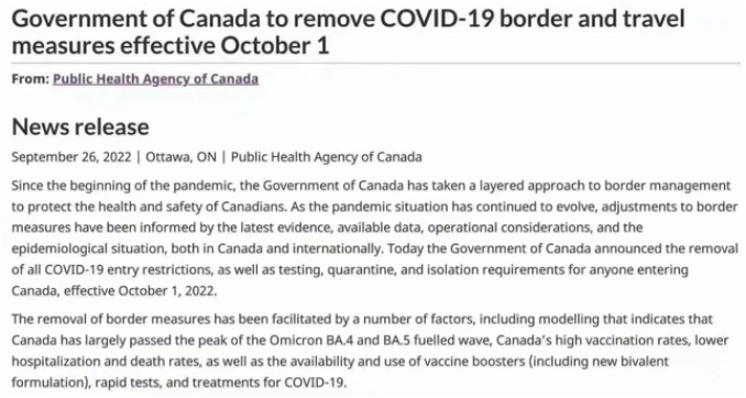 加拿大自10月1日起取消了所有针对新型冠状病毒的旅行限制,以进一步加快行业和加拿大经济的复苏。