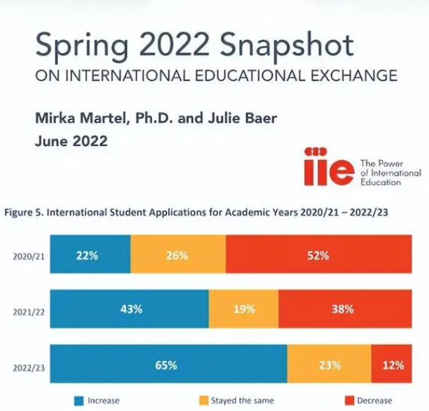 近日,国际教育协会发布了最新的2022年报告,展示了今年美国留学生的情况。报告显示,65%的美国高校表示,今年国际学生的申请数量显著增加,比疫情爆发第一年的2020年高出43%。此外,线下课程全面恢复。到2023年春天,89%的人将离开在线课程,回到校园“亲自学习”。新一轮的留学生返校潮即将到来。