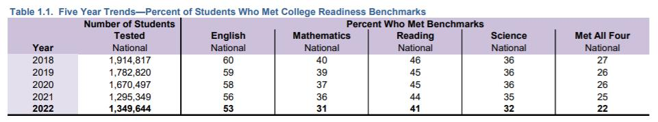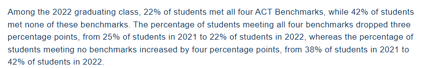 根据报告显示,参加ACT考试的2021-2022年的毕业生中,42%的学生没有达到英语、阅读、科推和数学的任何学科基准。