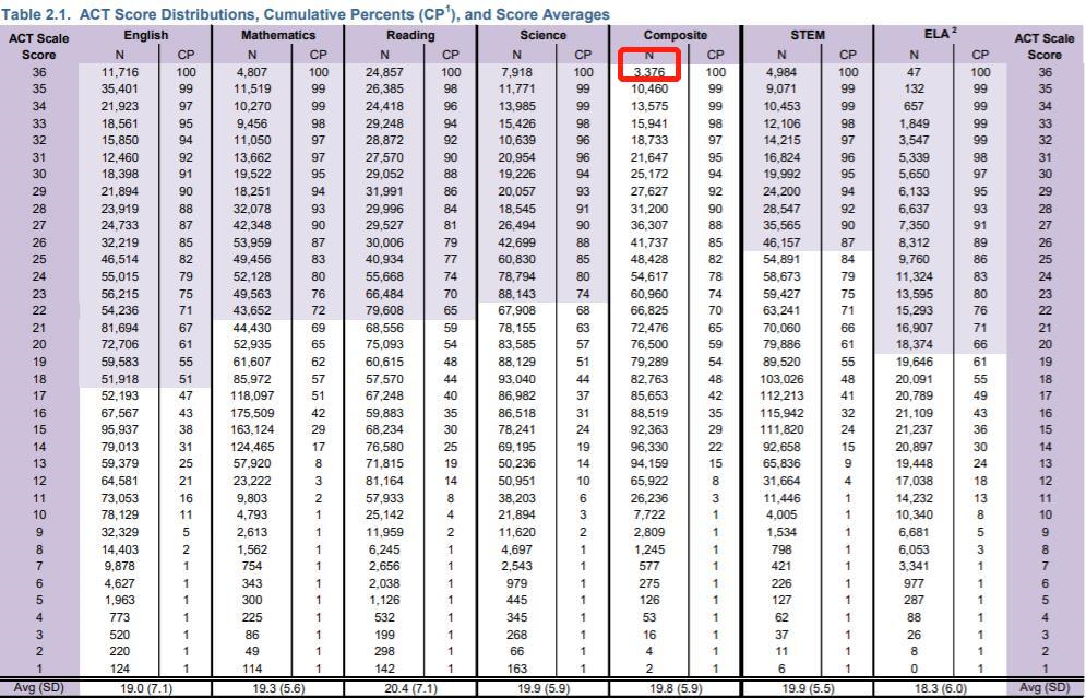 从全球成绩分布来看,ACT拿到满分36分的学生只有3376人,31分即为前5%,28分即为前10%的水平。31分即为前5%。