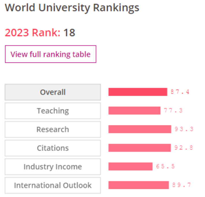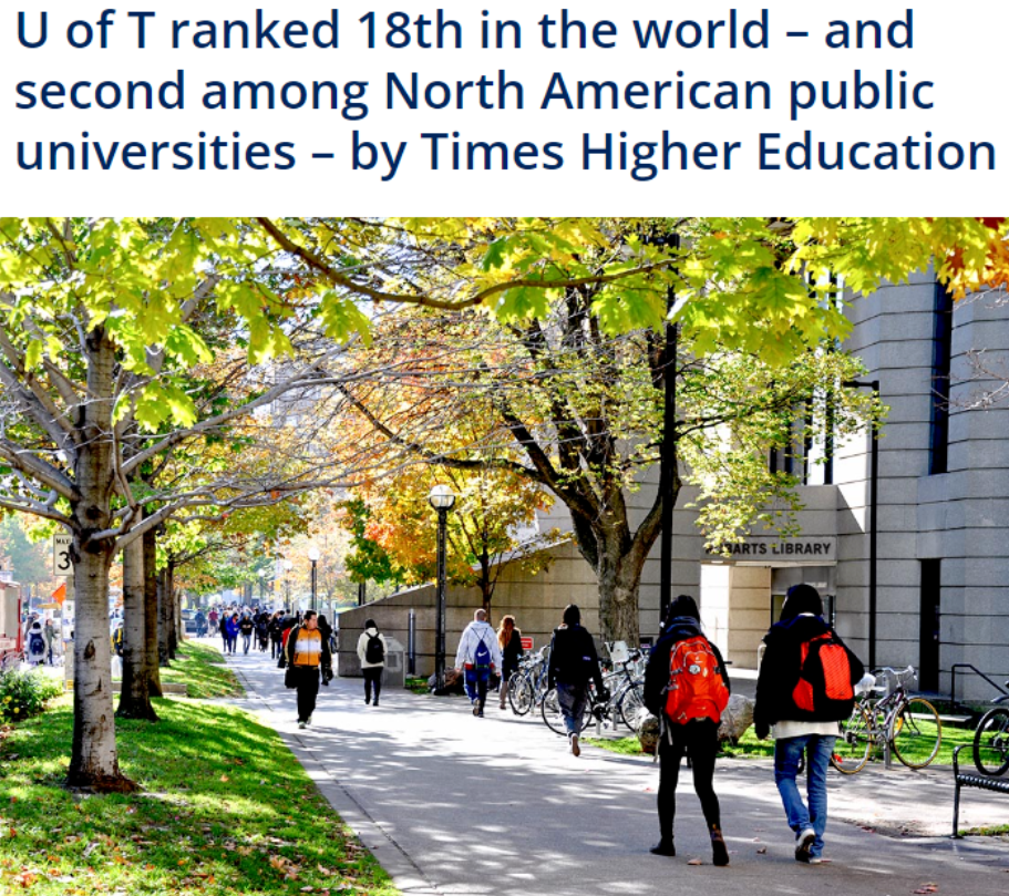 多伦多大学在《泰晤士报高等教育世界大学排名》中再次跻身世界前20名,连续第四年位列第18位。