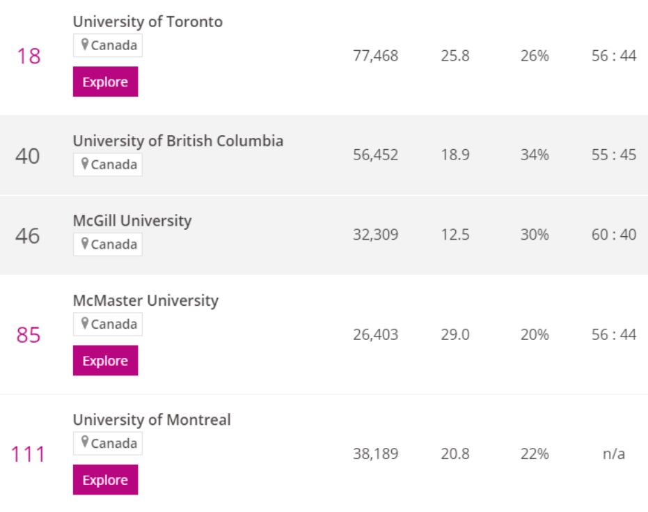 前100名中的其他加拿大大学包括:UBC(第40名)