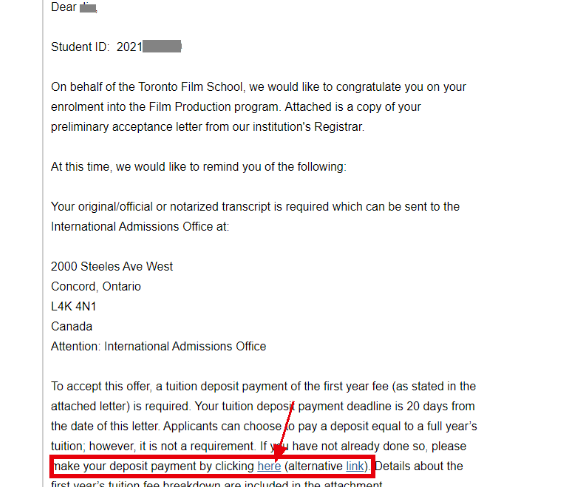 当同学们收到了录取信,在录取邮件里,学校会贴心地把每个同学 专用付款链接放到邮件里 。同学们只需点击进去,按步骤操作就可以付学费了。