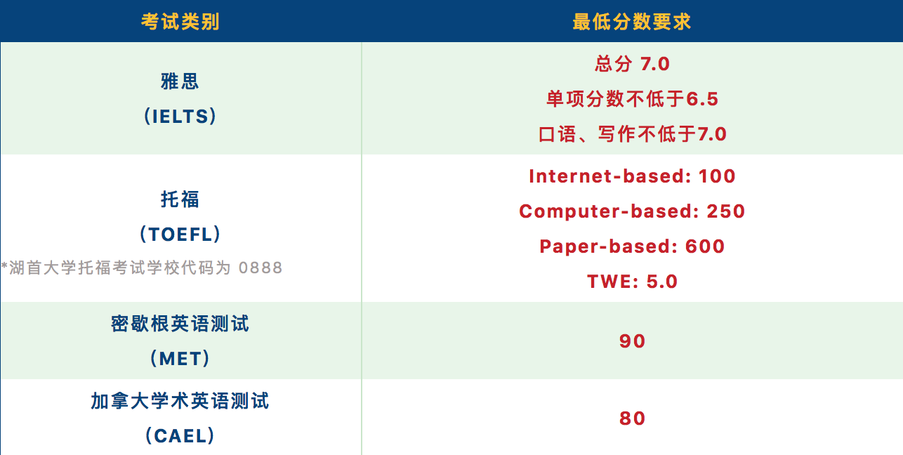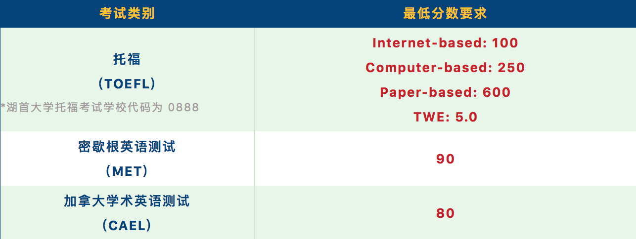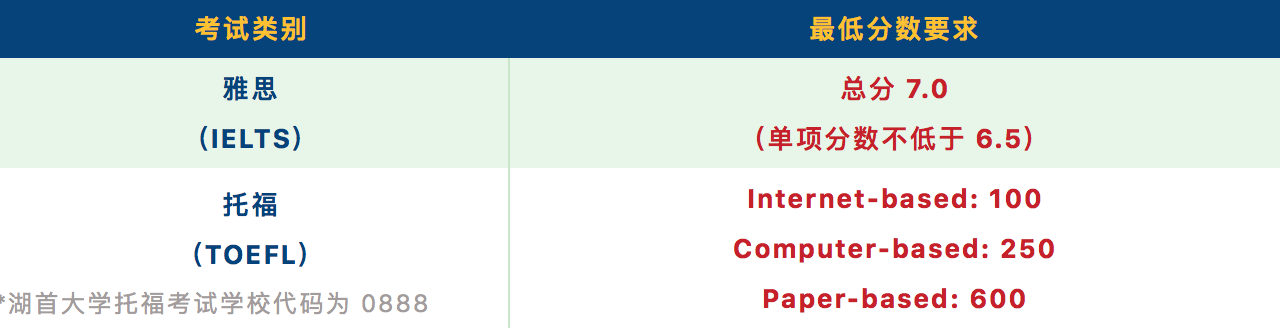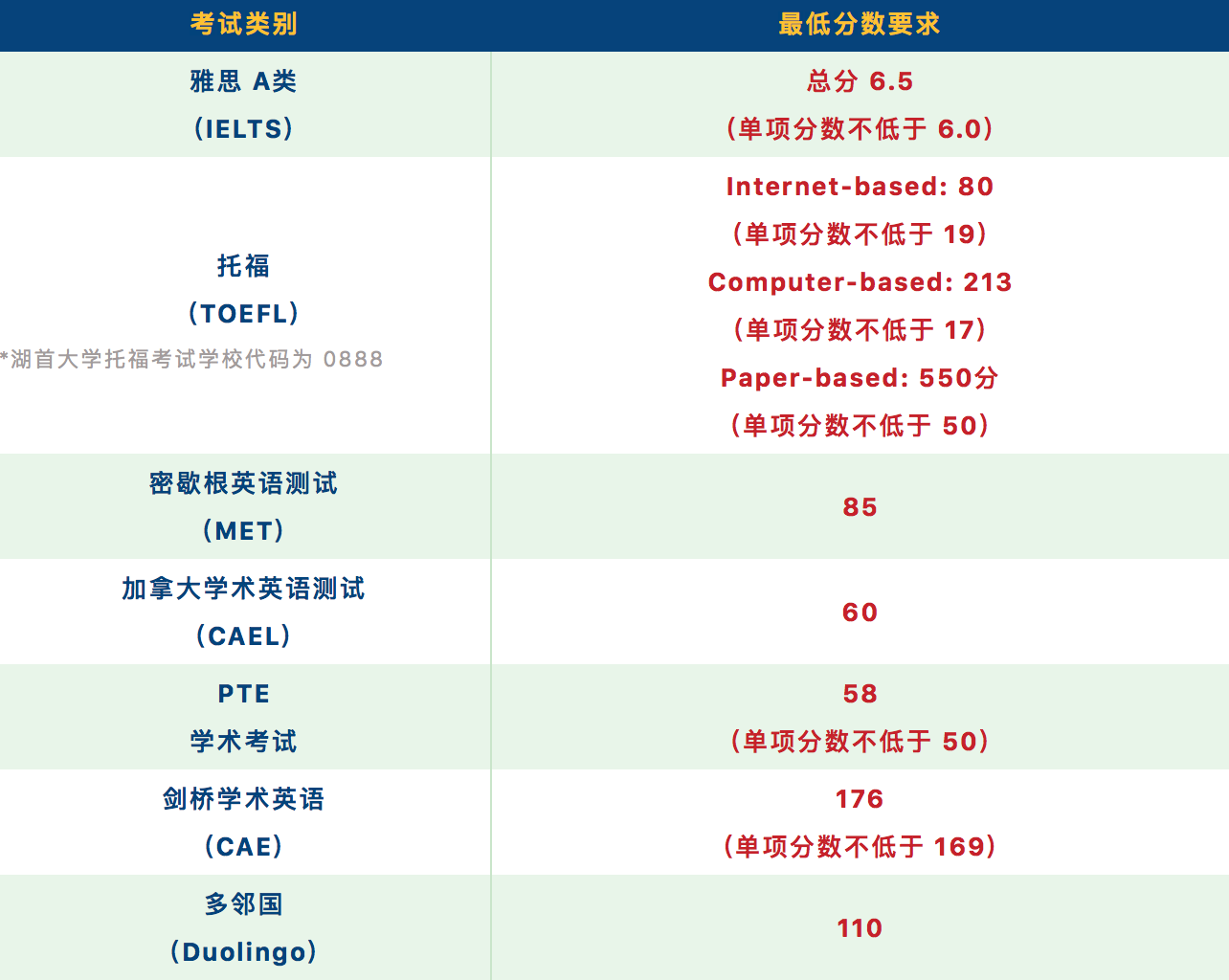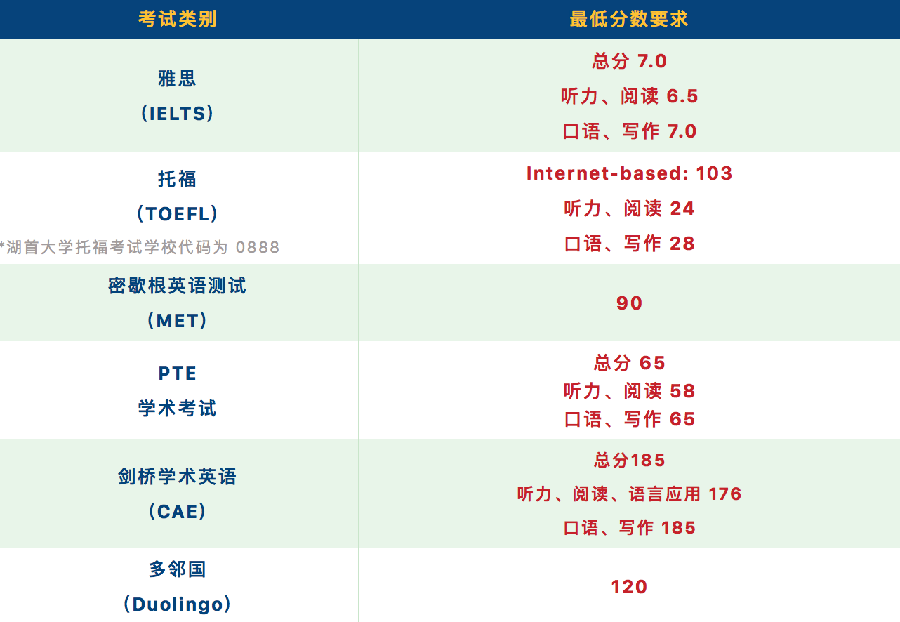 申请湖首大学研究生专业的国际申请人如果不符合语言豁免资格,需要参加以下认可的英语语言测试之一,并达到湖首大学所需的最低分数要求,具体要求如下: