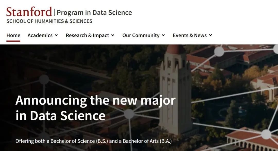 新增本科专业:数据科学 斯坦福大学宣布新增设本科专业数据科学。由此可见,大数据人才培养需求十分的火爆。 该专业由斯坦福大学的文理学院管理,向学生提供理科学士(BS)和文科学士(BA)两个培养路径/学位选项。