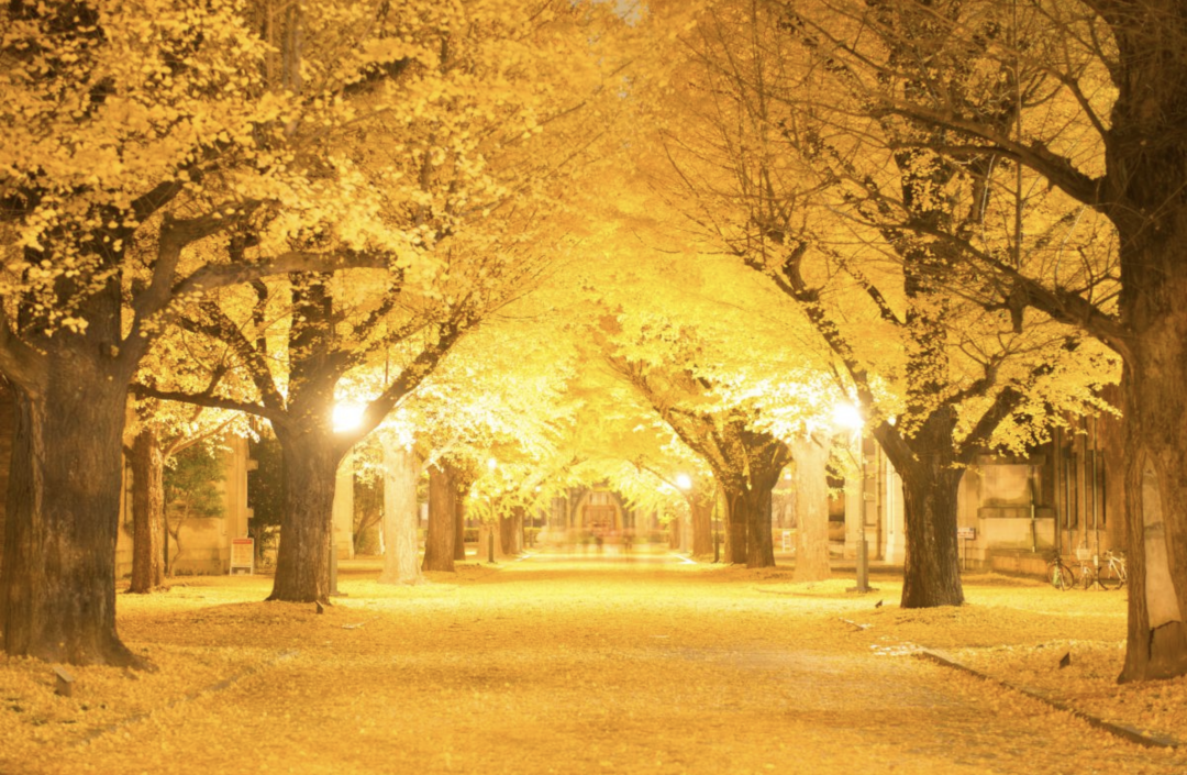 东京大学的校徽是两片交叠的银杏叶,在秋天从正门到著名的安田讲堂前的途中的100米的小路会变成金灿灿的银杏大道。银杏大道外东大校园在1号馆前的广场上还有一棵200年树齡的大银杏树。