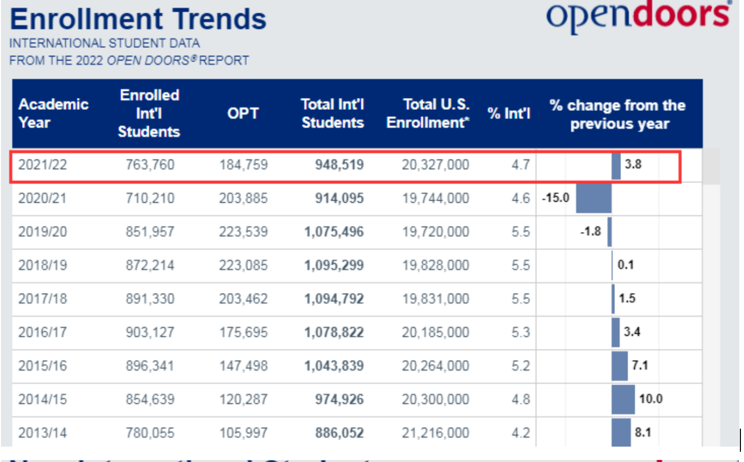 2021-22学年,在美国际生总数为 948,519,比上一年增长了3.8%,当然不可能直接升到2017-2019年的高峰水平,大概是2014-2015年的规模。