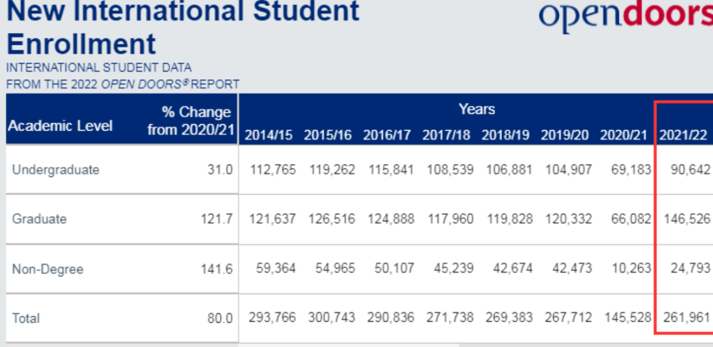 看上图的国际新生数据,2021-22学年共计261,961名国际新生入学,其实差不多恢复到疫情前2019-20学年的水平。