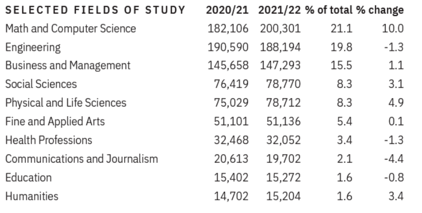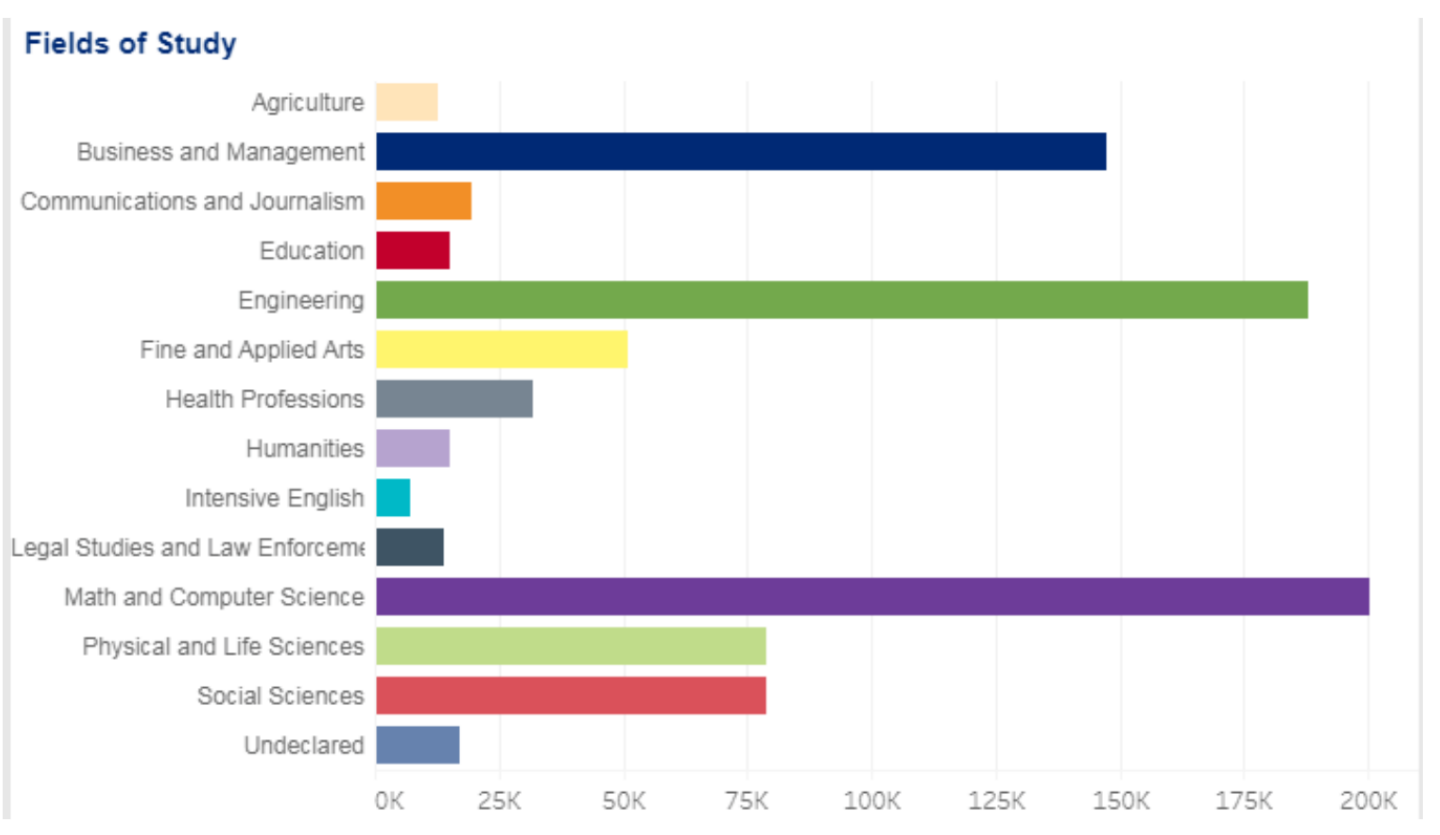 从留学生赴美攻读的学科来看,STEM依然是热门专业。数学与计算机科学、工程、商业与管理依然是留学生最爱专业前三。