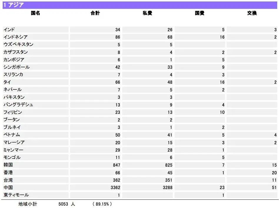 2020年,亚洲的学生有5053人,占到了89.15%, 其中中国大陆的学生有3362人,中国香港的学生有66人,中国台湾的学生有362人,中国的留学生占了早稻田留学生总人数的一半以上。