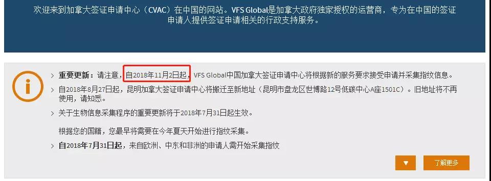 2.来自亚洲、亚太和美洲的申请人将于12月31日起,在申请加拿大签证时须亲赴签证中心录指纹。(中国公民11月2日开始)