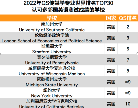 传媒学与新闻学一直是社会科学中非常热门的专业选择,随着网络自媒体的崛起,这两个专业的就业前景也不断提升。在2022年QS世界大学传媒学排名前30的美国大学中,目前依旧有不少学校接受多邻国英语测试成绩。如下图,这些院校都认可多邻国英语测试成绩 :