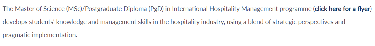 教学目的:国际酒店管理理学硕士课程(International Hospitality Management)旨在开发学生在酒店行业的知识和管理技能,采用战略观点和务实的实施相结合。