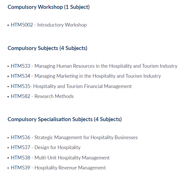 必修工作坊(一科) HTM5002 -入门研讨会 必修科目(4科) HTM533 -管理酒店和旅游业的人力资源 HTM534 -管理酒店和旅游业的营销 HTM535-酒店和旅游财务管理 HTM582 -研究方法 必修专业科目(4个科目) HTM536 -酒店业务的战略管理 HTM537 -酒店设计 HTM538 -多单位酒店管理 HTM539 -酒店收入管理 项目选项和选修课(选择1项) HTM598 -咨询项目加一个选修项目 HTM599 -研究项目 选修科目 HTM507 -文化旅游 HTM513 -中国酒店和旅游商业研究 HTM528 -全球旅游业的趋势和问题 HTM540 -酒店和旅游技术与创新 HTM541 -奢侈品管理 HTM568 -智能旅游和大数据分析 HTM5003 -管理实践
