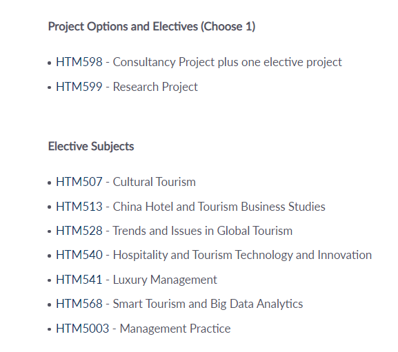 项目选项和选修课(选择1项) HTM598 -咨询项目加一个选修项目 HTM599 -研究项目 选修科目 HTM507 -文化旅游 HTM513 -中国酒店和旅游商业研究 HTM528 -全球旅游业的趋势和问题 HTM540 -酒店和旅游技术与创新 HTM541 -奢侈品管理 HTM568 -智能旅游和大数据分析 HTM5003 -管理实践